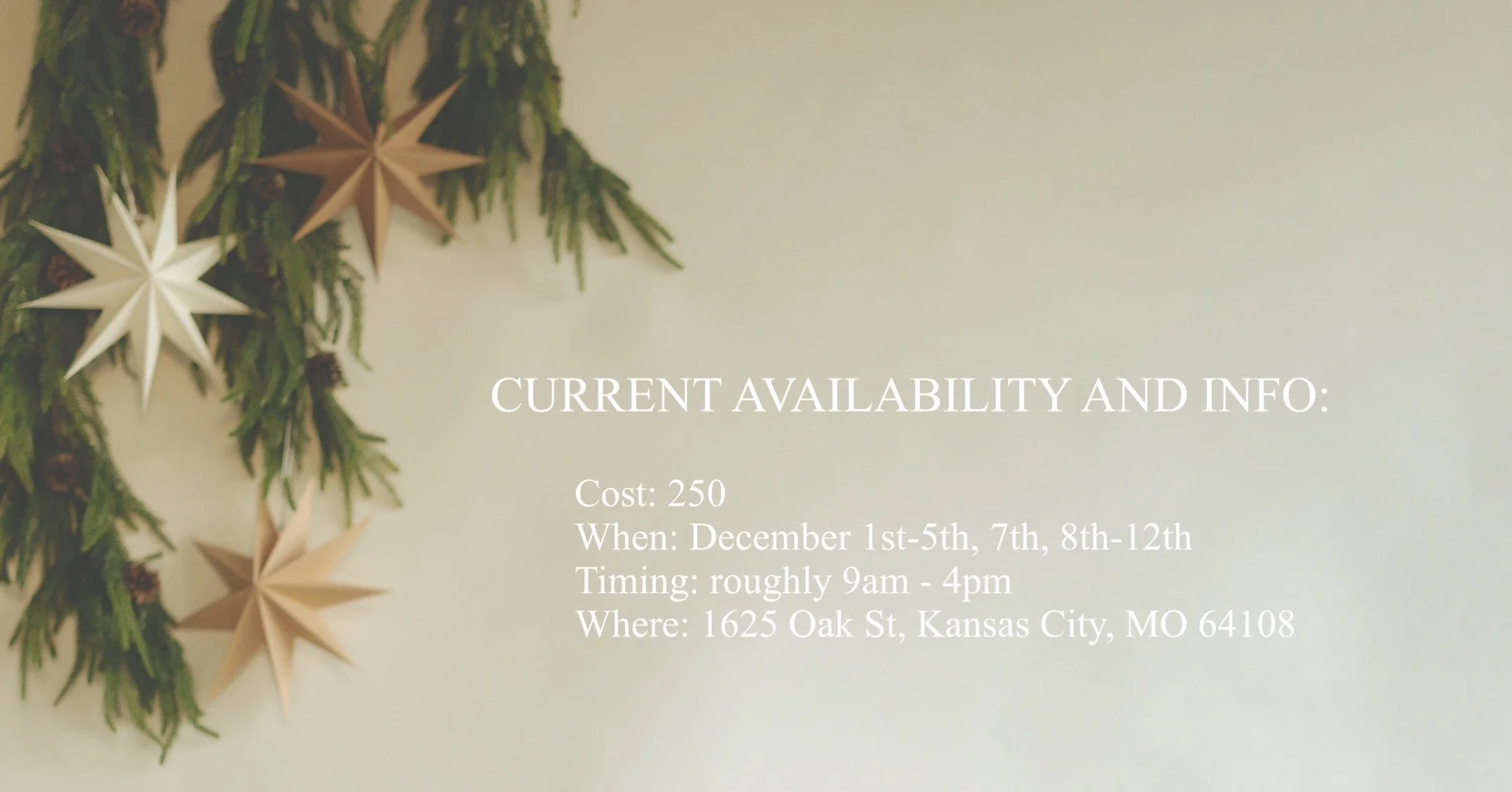 Each session will be 15 minutes. Families will receive 10 edited photos within 24-48hrs of your session to ensure a quick turnaround for your cards and gifts!